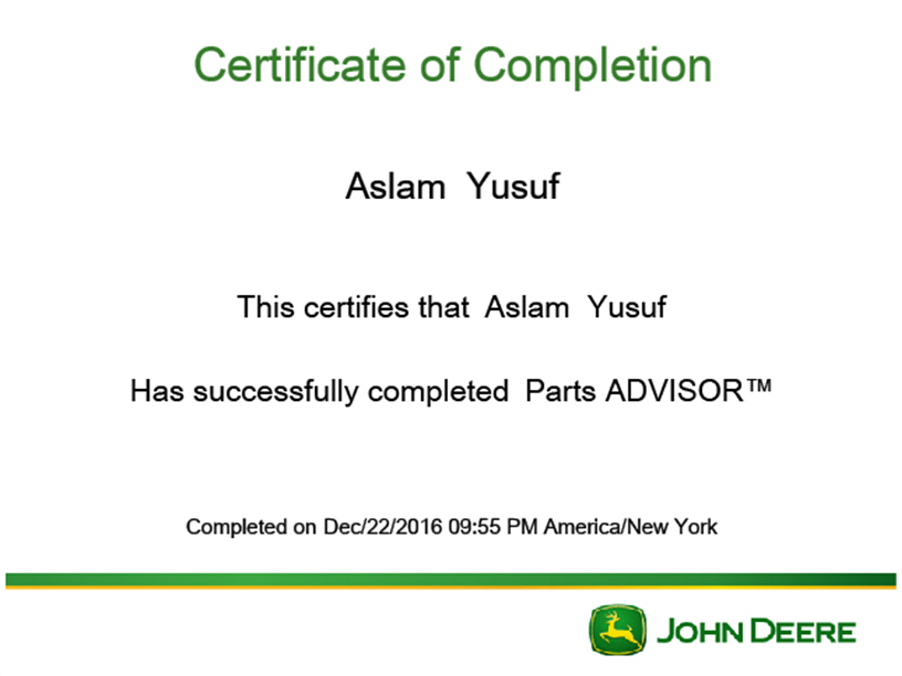 - Trained & certified by John Deere