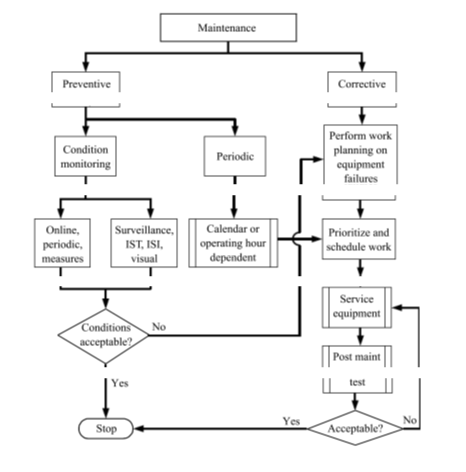 they were designed. The basic objectives of the maintenance activity are to deploy the minimum resources required to make sure that components perform their intended purposes properly, to ensure system reliability and to recover from breakdowns. As is shown in Figure, the overall maintenance strategy strategy consists of preventive and corrective maintenance programs.